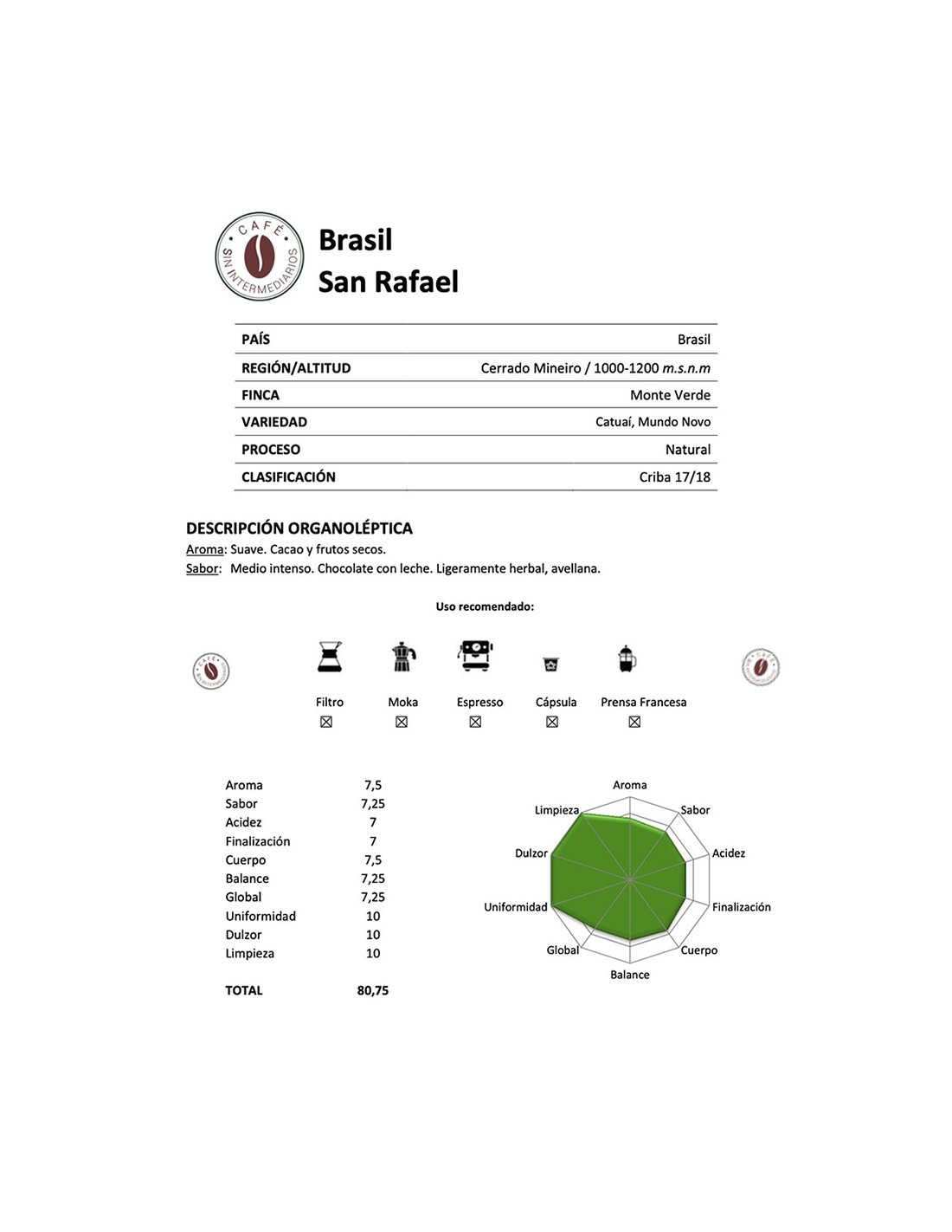 DESCRIPCIÓN ORGANOLÉPTICA Aroma: Suave, chocolate, almendras, hierba buena. Sabor: Suave, almendras tostadas, chocolate negro, manzanas rojas y limón. Bien balanceado con cuerpo redondo.